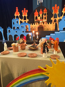 Participation gestuelle de quelques uns dans l’installation du décor (le soleil, la table de fête, manipulation des personnages) et participation verbale de tous dans l’élaboration de l’histoire.